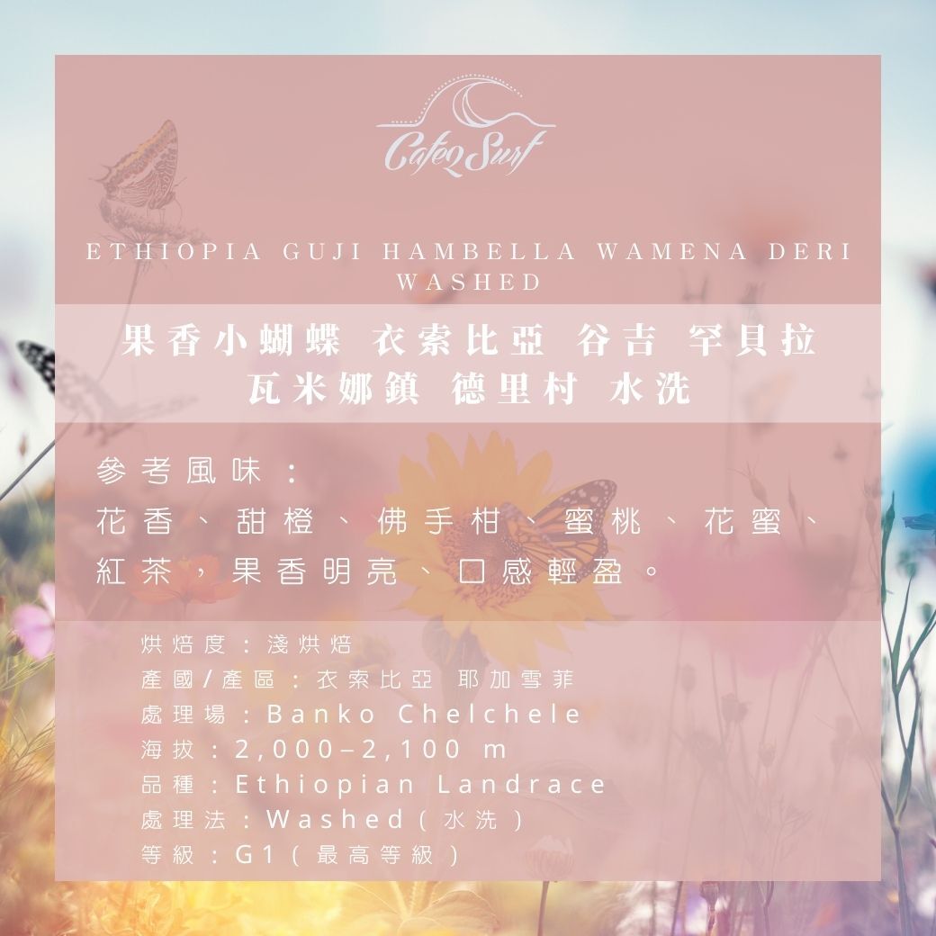 果香小蝴蝶濾掛咖啡,來自衣索比亞谷吉罕貝拉德里村水洗咖啡豆。花香、甜橙、佛手柑與蜜桃風味明亮,紅茶般清爽尾韻,輕鬆沖泡也能喝到精品風味。