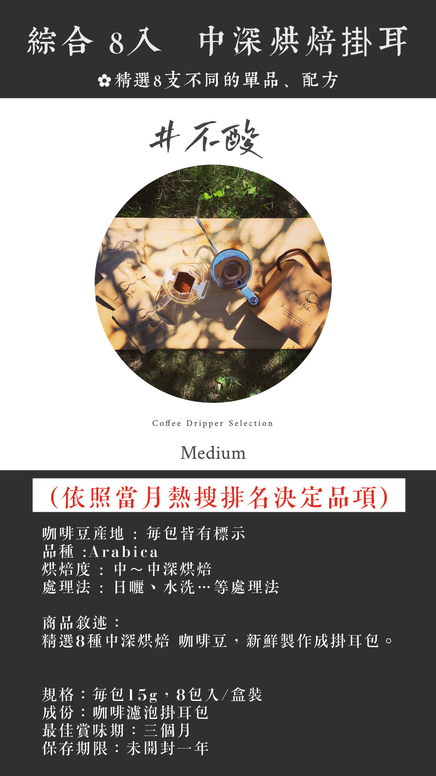 中烘焙~中深 “單品” 或 浪館 ”特製配方豆“ 製作成新鮮的掛耳,