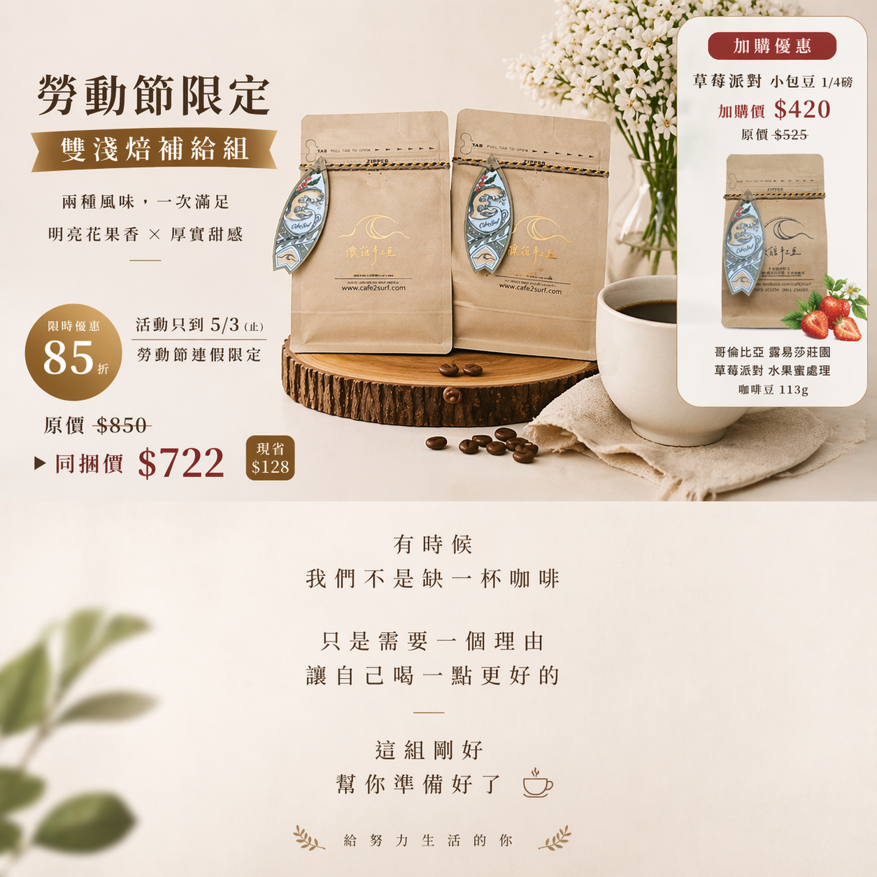 兩款精品淺焙單品一次擁有,白花柑橘的明亮與莓果甜感的厚實交織,限時85折。