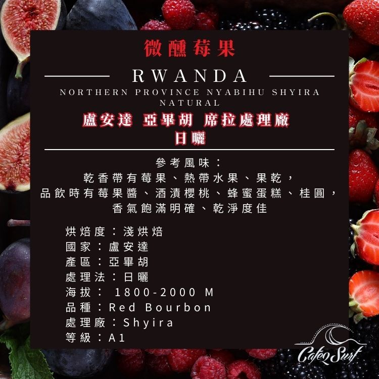 來自盧安達北部 亞畢胡 Nyabihu 高海拔產區,由 Shyira 處理廠處理的 Red Bourbon 日曬批次。高海拔與充足日照,使咖啡果實在乾燥過程中慢慢累積出濃郁的甜感與果香。