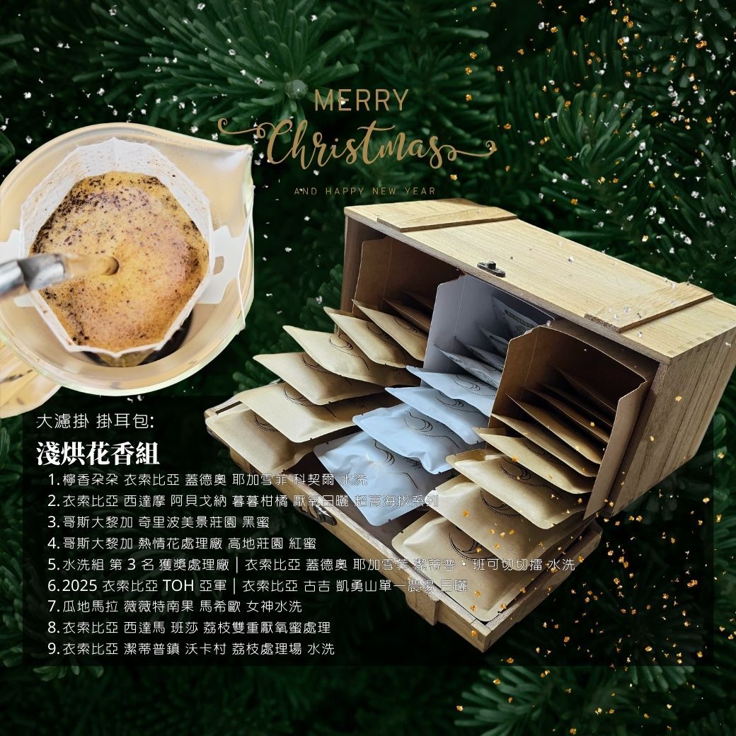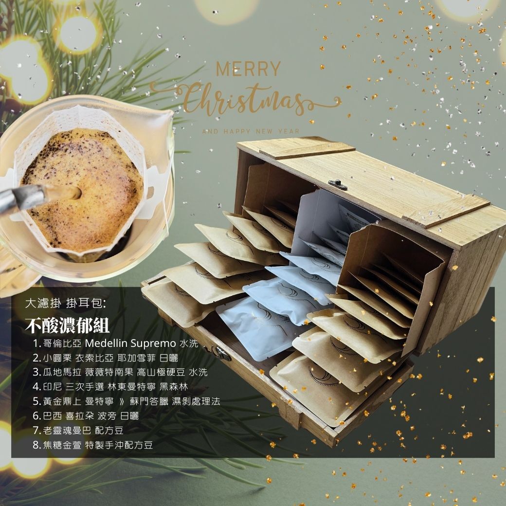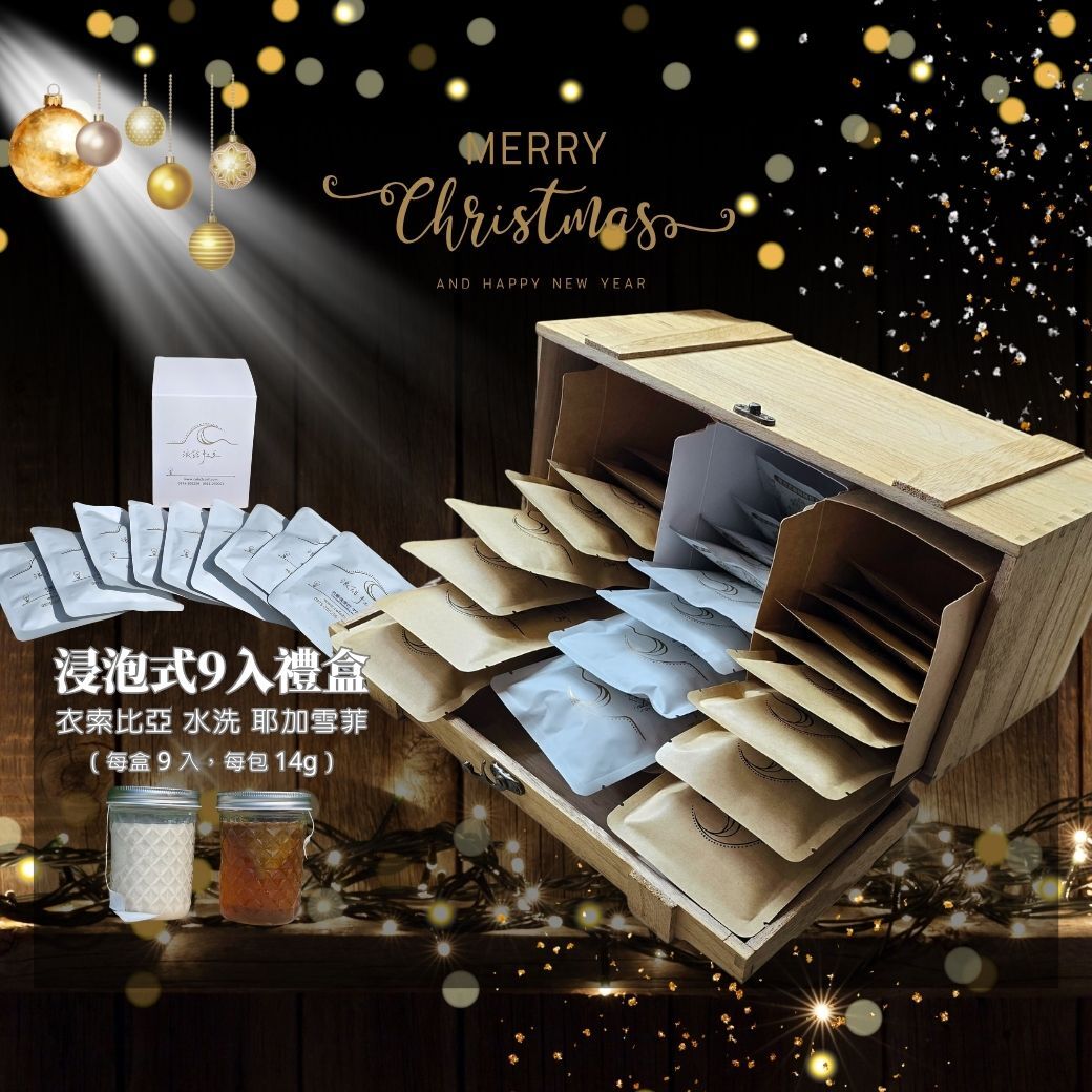 兩組濾掛禮盒(8 入+9 入)+ 一組淺焙浸泡式禮盒(9 入)。